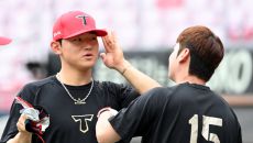 15일 광주KIA챔피언스필드에서 열린 롯데와 KIA의 경기, 타격훈련을 하던 김도영과 박정우가 이야기를 나누고 있다. 광주=허- 2025-05-15 15:49