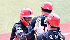24일 일본 오키나와 가데나 구장에서 열린 야구 대표팀과 KIA 타이거즈의 평가전. 카스트로가 투런포를 날린 뒤 환호하고 있다- 1시간전