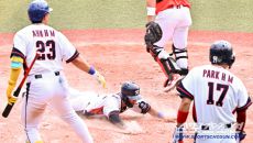24일 일본 오키나와 가데나 구장에서 열린 야구 대표팀과 KIA 타이거즈의 평가전. 짧은 안타 때 2루 주자 신민재가 홈을 파- 2시간전