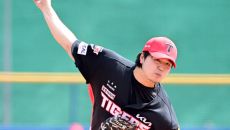 24일 일본 오키나와 가데나 구장에서 열린 야구 대표팀과 KIA 타이거즈의 평가전. 노경은이 역투하고 있다. 오키나와(일본)=- 2시간전