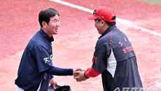 23일 일본 오키나와 가데나 구장에서 열린 야구 대표팀과 한화 이글스의 평가전. 경기 종료 후 류지현, 이범호 감독이 인사를- 10시간전
