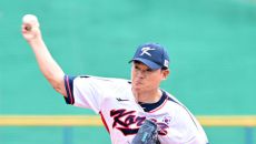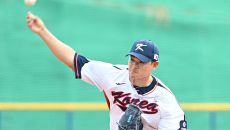 24일 일본 오키나와 가데나 구장에서 열린 야구 대표팀과 KIA 타이거즈의 평가전. 노경은이 역투하고 있다. 오키나와(일본)=- 11시간전