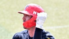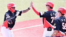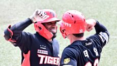24일 일본 오키나와 가데나 구장에서 열린 야구 대표팀과 KIA 타이거즈의 평가전. 카스트로가 투런포를 날린 뒤 환호하고 있다- 14시간전