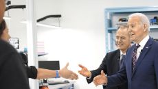조 바이든(오른쪽) 미 대통령이 28일(현지 시각) 미국 노스캐롤라이나주 더럼의 반도체 제조업체 울프스피드 사무실을 그레그 로- 2023-03-30 03:00