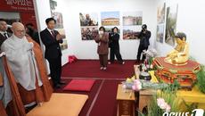 상월결사 인도순례 부처님에 합장하는 진우 스님과 오세훈 시장