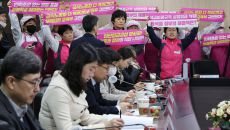박미향 전국학교비정규직노동조합(학교비정규직노조) 위원장과 조합원들이 30일 오전 서울 여의도 한국교육시설안전원에서 열린 제1차- 2023-03-30 14:52