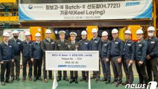 (서울=뉴스1) = 30일 경남 거제 대우조선해양에서 '장보고-Ⅲ 배치(Batch·유형)-Ⅱ' 선도함 기공식에서 참석자들이 기- 2023-03-30 14:50
