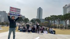 마륵호반저지 쌍용입주민 비상대책위원회가 오늘(30일) 오전 광주시청 앞에서 집회를 열고 있다. / 사진=대책위 제공 광주 서구- 2023-03-30 14:36