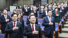 (서울=뉴스1) 허경 기자 = 주호영 국민의힘 원내대표가 30일 서울 여의도 국회에서 열린 의원총회에서 의원들과 함께 국민의례- 2023-03-30 14:07