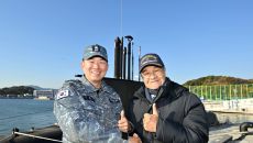 (서울=뉴스1) = 안병구 초대함장(오른쪽)과 이제권(소령) 장보고함장이 19일 대한민국 1번 잠수함 장보고함의 마지막 항해를- 2025-11-19 15:52