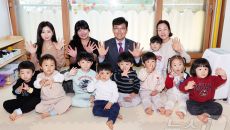 (청주=뉴스1) = 윤건영 충북교육감이 19일 충청북도 청주의 가정어린이집을 찾아 보육환경 등을 점검한 후 기념 촬영을 하고- 2025-11-19 15:48