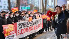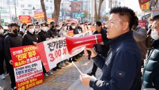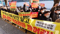 (서울=뉴스1) 안은나 기자 = 더본코리아 점주들과 예산상설시장 상인들이 19일 오후 서울 서초구 전국가맹점주협의회 앞에서 '- 2025-11-19 15:01