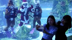 산타와 루돌프 복장을 한 아쿠아리스트들이 16일 서울 송파구 롯데월드 아쿠아리움 메인 수조 안에서 방문객들에게 인사하고 있다.- 2025-12-17 00:47