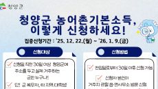 [이용현 기자] 충남 청양군이 오는 22일부터 내년 1월 30일까지 '농어촌 기본소득 시범사업' 신청을 받는다고 밝혔다. '농- 2025-12-18 10:50