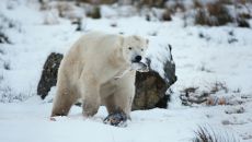눈밭 위 모성애…어미 잃은 아기곰 입양한 북극곰 포착