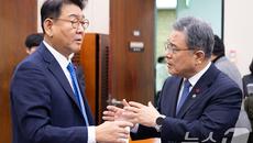 종묘 재개발 관련 대화 나누는 김교흥 문체위원장과 허민 국가유산청장