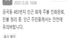 부산 북구 금곡동에서 일어난 화재가 초기 진화됐다. 북구청은 26일 오후 4시 6분께 "금곡동 483번지 인근 화재 주불이 진- 2025-12-26 16:11
