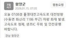 톹영대전고속도로에서 차량 화재가 발생했다. 15일 함양군은 안전재난문자를 통해 "이날 7시 8분경 톹영대전고속도로 대전방향(수- 2026-01-15 07:43