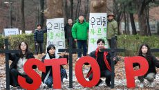 환경보건시민센터와 서울환경연합 활동가들이 15일 서울 경희궁 내 나무들이 벌목된 ‘경희궁지 생태 기후 환경숲 조성 사업’ 현장- 3시간전