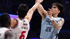 5일 고양 소노아레나에서 열린 프로농구 고양 소노와 안양 정관장의 경기. 고양 켐바오가 안양 수비를 앞에 두고 슛을 시도하고- 2026-03-05 19:19
