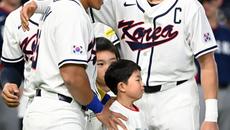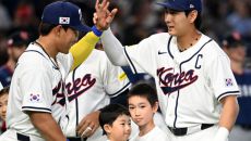5일 일본 도쿄돔에서 열린 WBC(월드베이스볼클래식) 한국과 체코의 경기. 선수 소개때 안현민,이정후가 하이파이브를 하고 있다- 2026-03-05 18:55