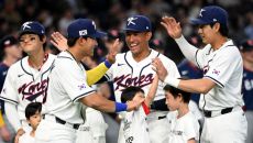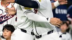 5일 일본 도쿄돔에서 열린 WBC(월드베이스볼클래식) 한국과 체코의 경기. 선수 소개때 자마이 존스와 이정후가 포옹을 하고 있- 2026-03-05 18:53
