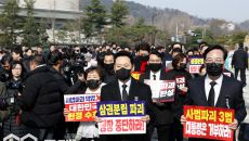 [이용우 기자] (서울=국제뉴스) 장동혁 국민의힘 대표와 송언석 원내대표를 비롯한 의원들이 5일 서울 종로구 청와대 사랑채 앞- 6시간전