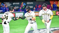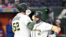 WBC 호주 야구대표팀의 퍼킨스(가운데)가 5일 일본 도쿄 도쿄돔에서 열린 대만과의 경기 5회말 대만 투수 천보위를 상대로 2- 8시간전