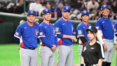 WBC 대만야구대표팀의 정하오쥐(맨 왼쪽)이 5일 일본 도쿄 도쿄돔에서 열린 호주와의 경기에 앞서 선수들과 함께 식전행사를 진- 8시간전