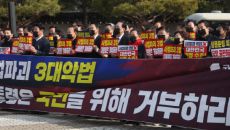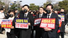 장동혁 국민의힘 대표와 송언석 원내대표를 비롯한 소속 의원들이 5일 청와대 사랑채 앞에서 의원총회를 마친 뒤 손팻말을 들고 청- 8시간전