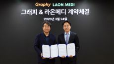 그래피 박성현 상무(오른쪽)와 라온메디 김일훈 부사장(왼쪽)이 양사 계약 체결 후 기념촬영을 하고 있다. 그래피(대표 심운섭)- 2026-03-25 01:06