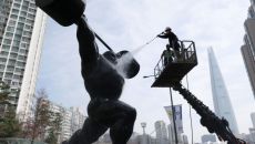 25일 오전 서울 송파구 올림픽로에서 관계자들이 봄을 맞아 올림픽 상징 조형물 세척 작업을 하고있다. ※CBS노컷뉴스는 여러분- 19시간전