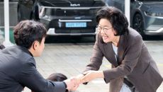 취재진과 악수하는 이혜훈 기획예산처 장관 후보자