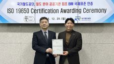 손훈 국가철도공단 철도혁신연구원장(오른쪽)과 임성환 BSI코리아 대표이 29일 ISO 19650 인증서 수여식에서 기념촬영을- 2025-12-29 16:51