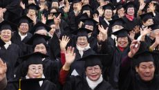 29日,在位于京畿道安养市东安老人福利会馆内举行的“老人大学第29届毕业典礼”上,头戴学士帽的老人们正在微笑着挥手致意。 具攸庭 기자 ju- 2025-12-29 16:27