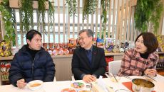 장인홍 구로구청장이 29일 서울 구로구 화원종합사회복지관 내 '서울마음편의점' 개소식에서 주민들과 라면을 먹으며 대화하고 있다- 2025-12-29 16:09