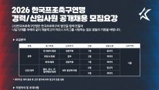 한국프로축구연맹이 신입 및 경력사원을 공개 채용한다. 직무는 인사총무팀장, 변호사, 회계, 홍보, 유스지원, IP사업 및 기타- 2025-12-29 21:17