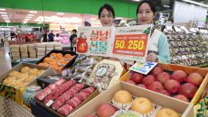 2일 서울 서초구 양재동 하나로마트에서 모델들이 과일과 축산품 등으로 구성된 설 명절 선물 세트를 선보이고 있다. 하나로마트는- 2026-02-03 00:30