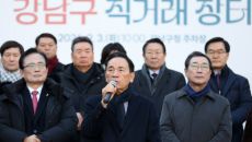 [이데일리 김태형 기자] 조성명(가운데) 강남구청장이 3일 강남구 설맞이 직거래장터 개장식에서 인사말을 하고 있다. 강남구청- 2026-02-03 14:48