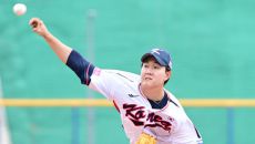 [사진]힘차게 공 뿌리는 대표팀 유영찬