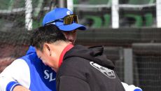 [사진]박진만 감독, SSG으로 이적한 조동찬 코치와 반갑게
