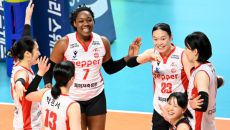 6일 장충체육관에서 열린 V리그 여자부 GS칼텍스와 페퍼저축은행의 경기. 1세트를 승리한 페퍼저축은행 선수들이 기뻐하고 있다.- 2026-01-06 19:43