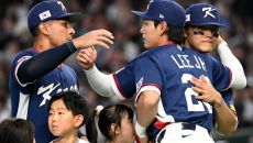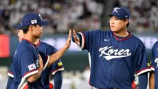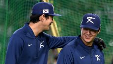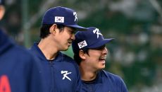 7일 일본 도쿄돔에서 열린 WBC(월드베이스볼클래식) 한국과 일본의 경기. 선수 소개때 류현진이 정우주를 맞이하고 있다. 도쿄- 1시간전