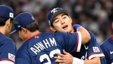 7일 일본 도쿄돔에서 열린 WBC(월드베이스볼클래식) 한국과 일본의 경기. 선수 소개때 이정후가 안현민과 포옹을 하고 있다.- 1시간전