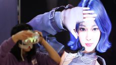 4일 서울 강남구 코엑스에서 열린 ‘AI(인공지능) 콘텐츠 페스티벌 2025’에서 참가자가 가상 아티스트의 화면을 배경으로 콘- 19시간전