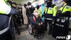 (서울=뉴스1) 김성진 기자 = 박경석 전국장애인차별철폐연대(전장연) 대표가 1일 서울 종로구 4호선 혜화역에서 열린 장애인- 2023-12-01 09:09