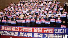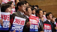 (서울=뉴스1) 송원영 기자 = 더불어민주당 의원들이 1일 오후 서울 여의도 국회 로텐도홀 게단에서 거부권 남발 규탄 및 민생- 2023-12-01 14:59