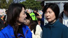 (서울=뉴스1) 박정호 기자 = 더불어민주당 백혜련 의원(오른쪽)과 이재정 의원이 21일 오전 서울 종로구 재동 헌법재판소 앞- 2025-03-21 11:47