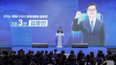 (울산=뉴스1) 안은나 기자 = 김동연 더불어민주당 대선 경선 후보가 20일 오후 경남 울산전시컨벤션센터에서 열린 영남권 합동- 2025-04-20 15:44