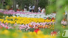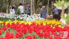 (전주=뉴스1) 유경석 기자 = 20일 전북자치도 전주시 한국도로공사 전주수목원을 찾은 시민들이 활짝 핀 튤립을 구경하고 있다- 2025-04-20 14:49